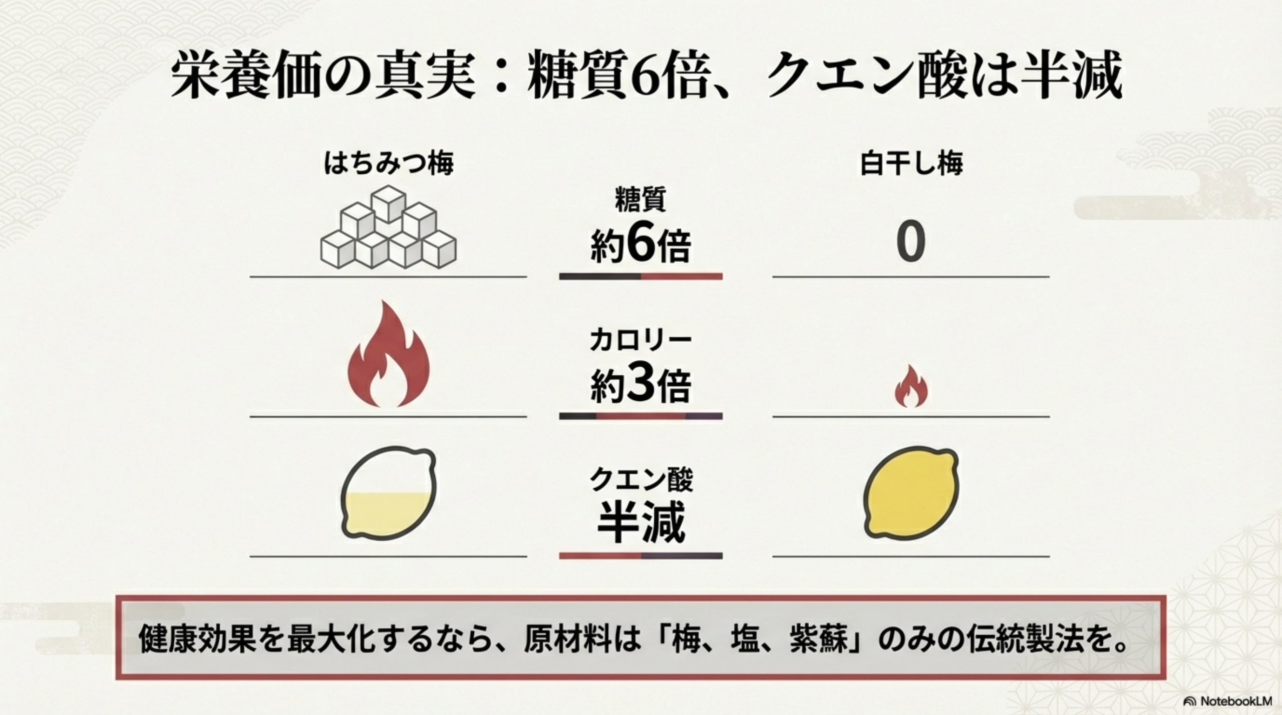 健康効果を重視するなら、クエン酸含有量が多く添加物のない伝統的な梅干しが有利です。はちみつ梅干しは食べやすさと梅リグナン増加のメリットがありますが、糖質は約6倍になります。