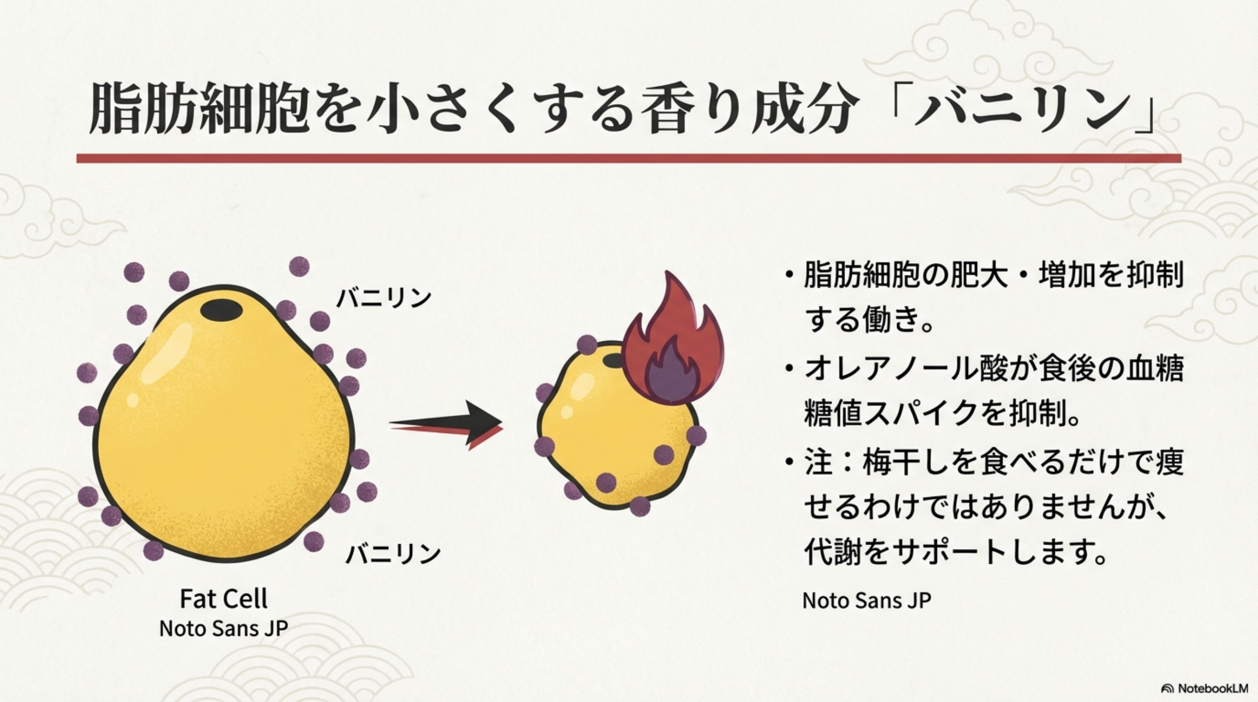 梅干しに含まれるバニリンは「ダイエットに効く成分」として紹介されることが多い成分です。基礎研究で確認されているメカニズムと、現時点でのヒトへの適用範囲を整理します。