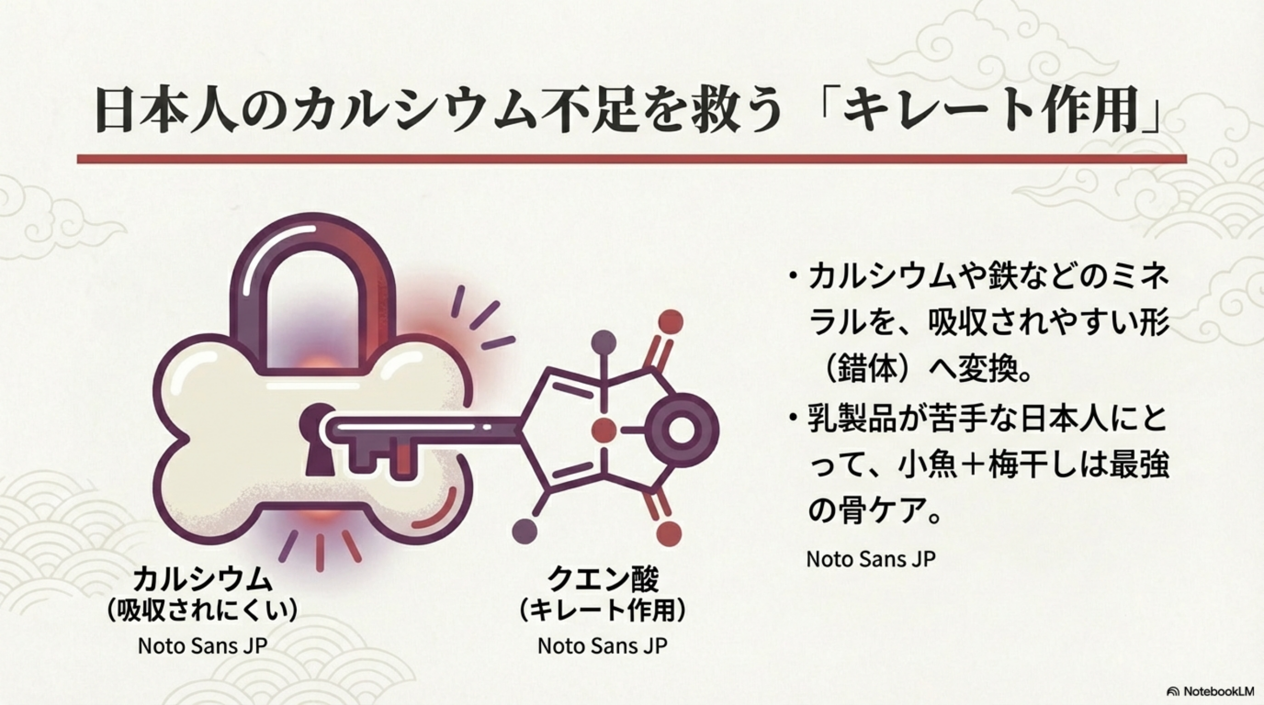 とくに骨の成長期にある子どもや、骨粗しょう症の発症率が高い女性・高齢者にとって、カルシウムの吸収を助ける食品は重要です。日本人の約85%は乳糖不耐性の傾向があるとされ、乳製品からのカルシウム摂取が十分にできない方も少なくありません。梅干しを和食に取り入れることで、小魚や海藻などに含まれるカルシウムの吸収率を高めるという活用法は、日本人の食文化に適したアプローチといえるでしょう。