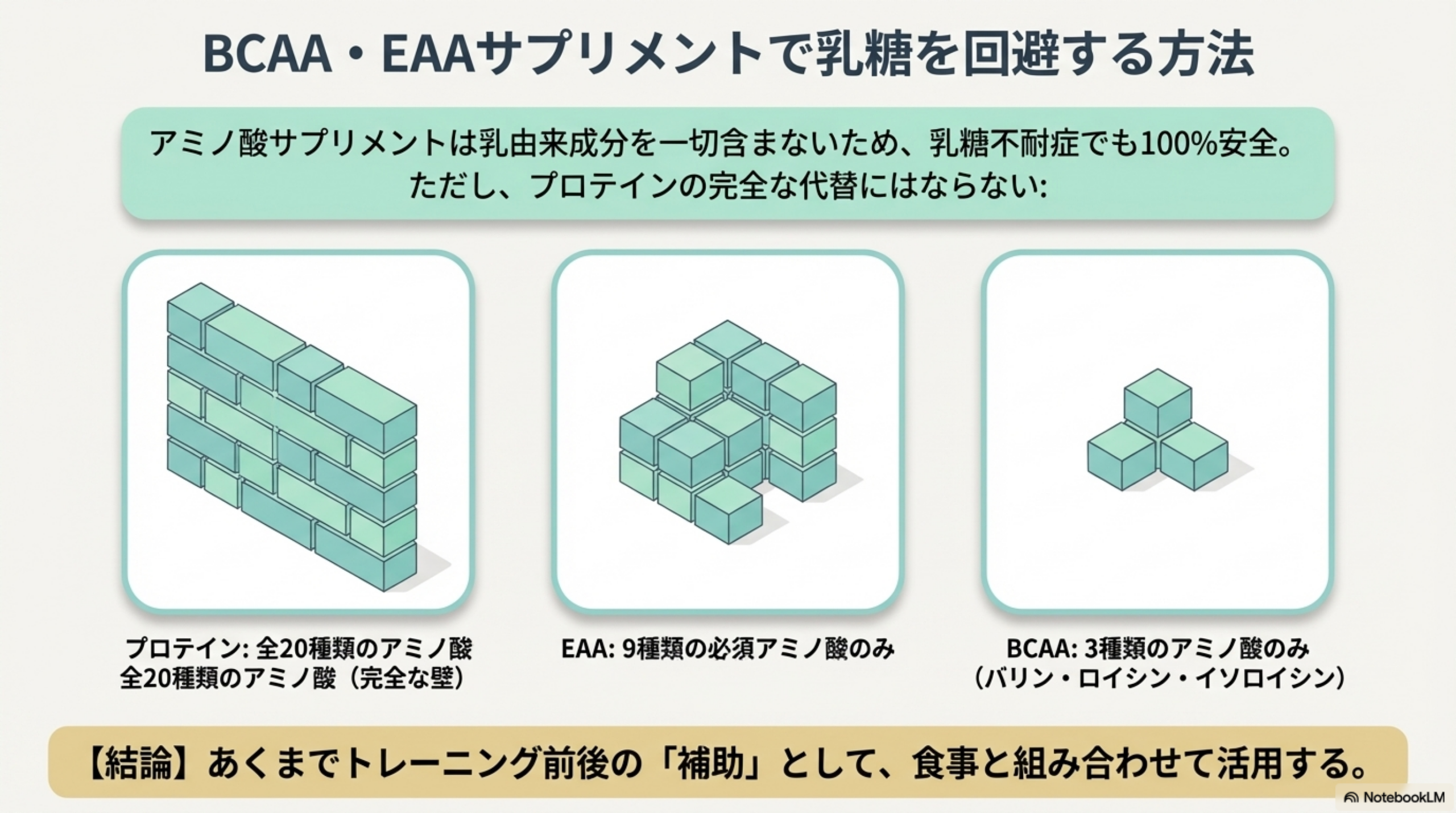 プロテイン以外のアプローチとして、BCAA(分岐鎖アミノ酸)やEAA(必須アミノ酸)のサプリメントを活用する方法もあります。これらは乳由来成分を含まないため、乳糖不耐症の方でも安心です。