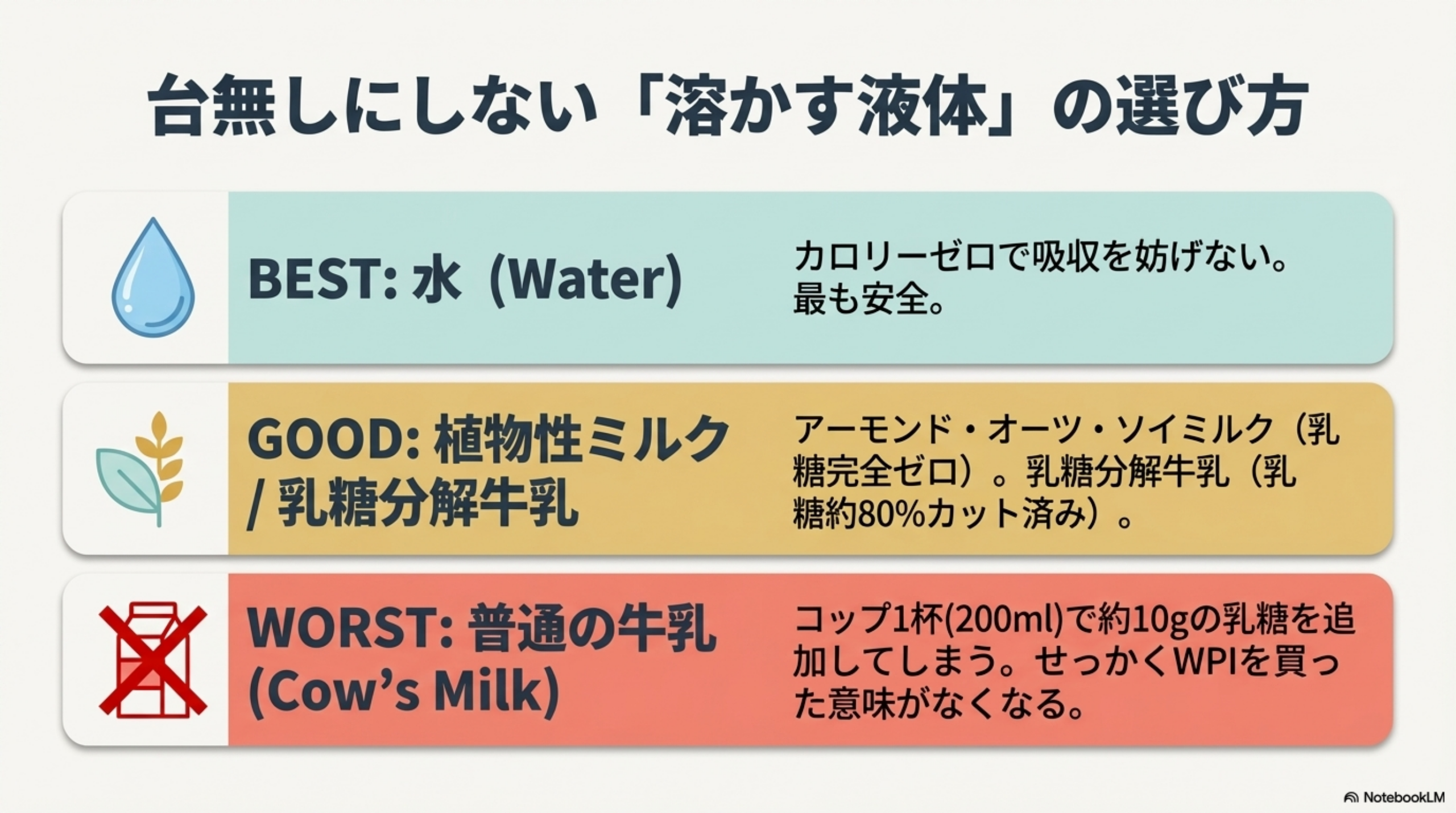 溶かす液体の選び方(水・植物性ミルク・乳糖分解牛乳)