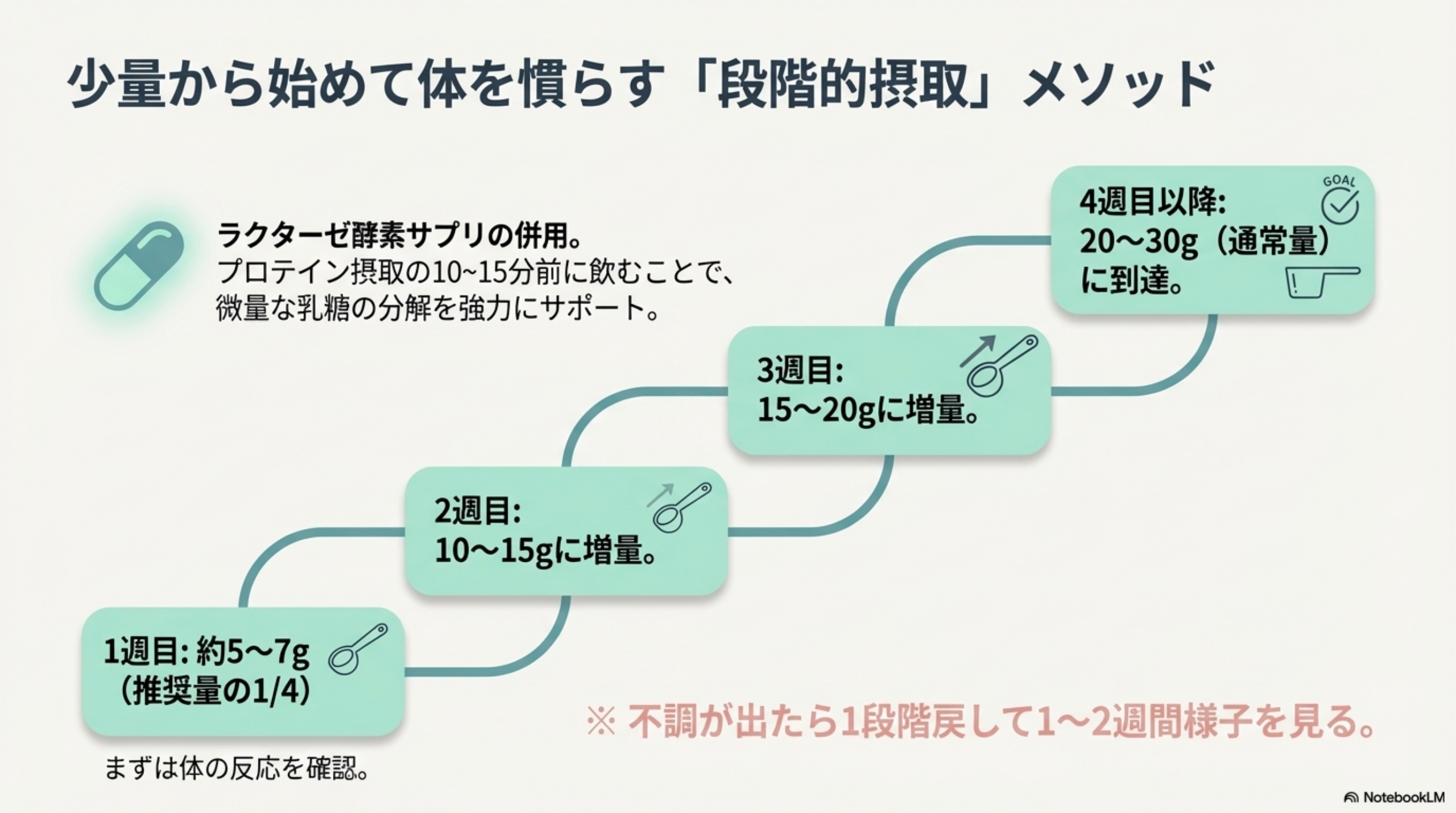 新しいプロテインに切り替える際は、段階的な増量がトラブルを防ぐ鍵です。いきなり通常量(20〜30g)を摂取すると、WPIでも体が慣れておらず不調が出る可能性があります。