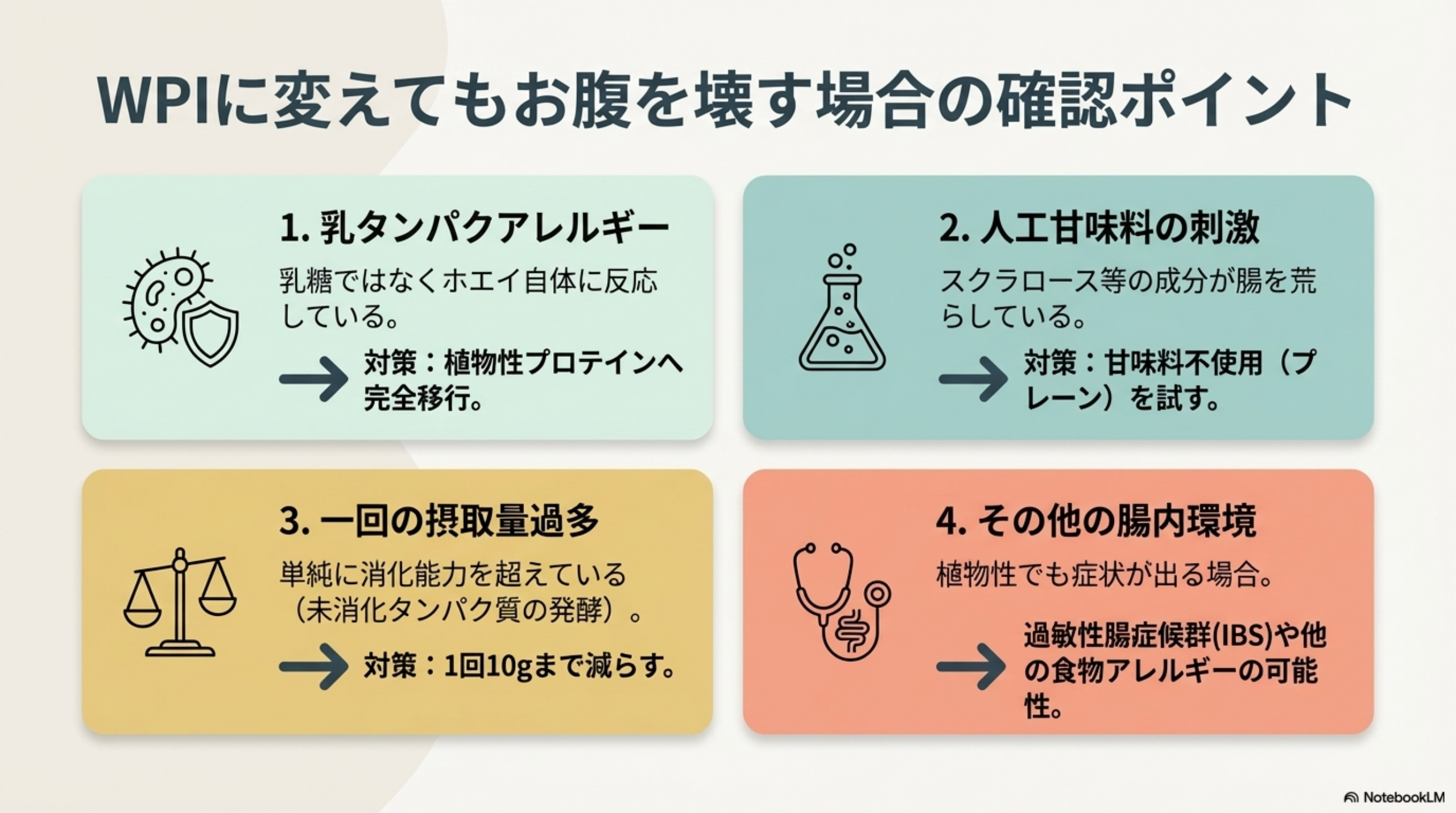 ④ 植物性プロテインでも症状が出る場合:プロテインサプリメント以外の原因(過敏性腸症候群、食物アレルギー等)の可能性があります。