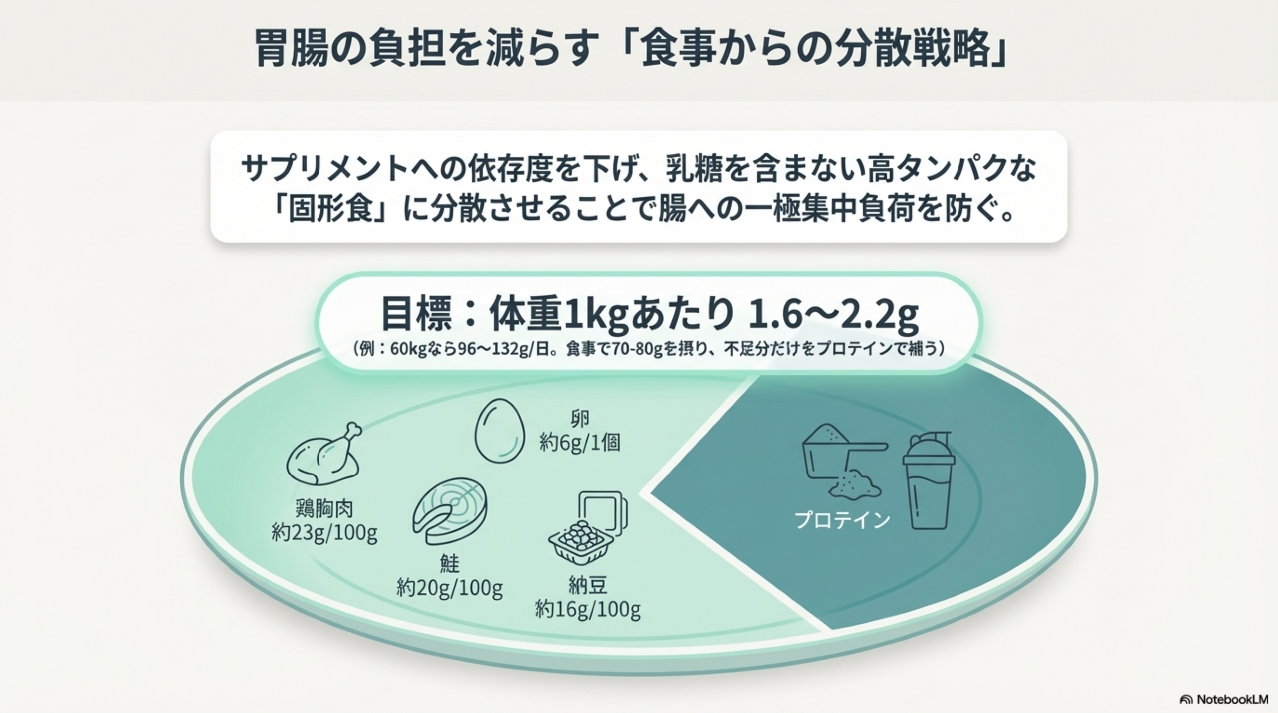プロテインサプリメントだけに頼らず、日常の食事からもタンパク質を分散摂取することで、胃腸への負担を減らせます。乳糖不耐症の方にとっては、プロテインサプリの摂取量を抑えられるという点でも効果的です。