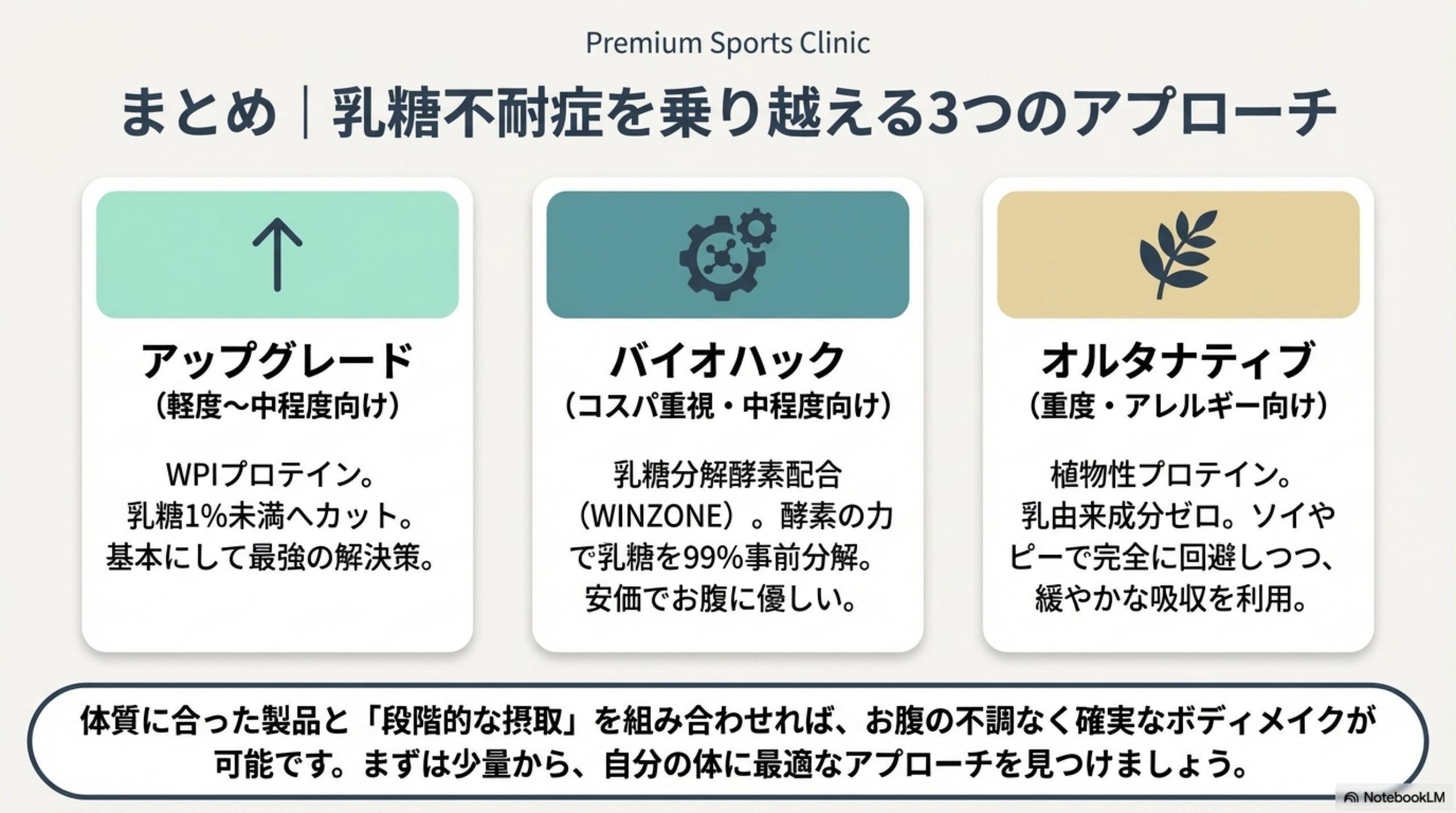 あります。WPIを選ぶ、乳糖分解酵素配合のプロテイン(WINZONEなど)を選ぶ、ラクターゼ酵素サプリと併用する、水や植物性ミルクで溶かす、少量から始めて段階的に増やす——これらを組み合わせることで、多くの方がホエイプロテインを摂取できます。