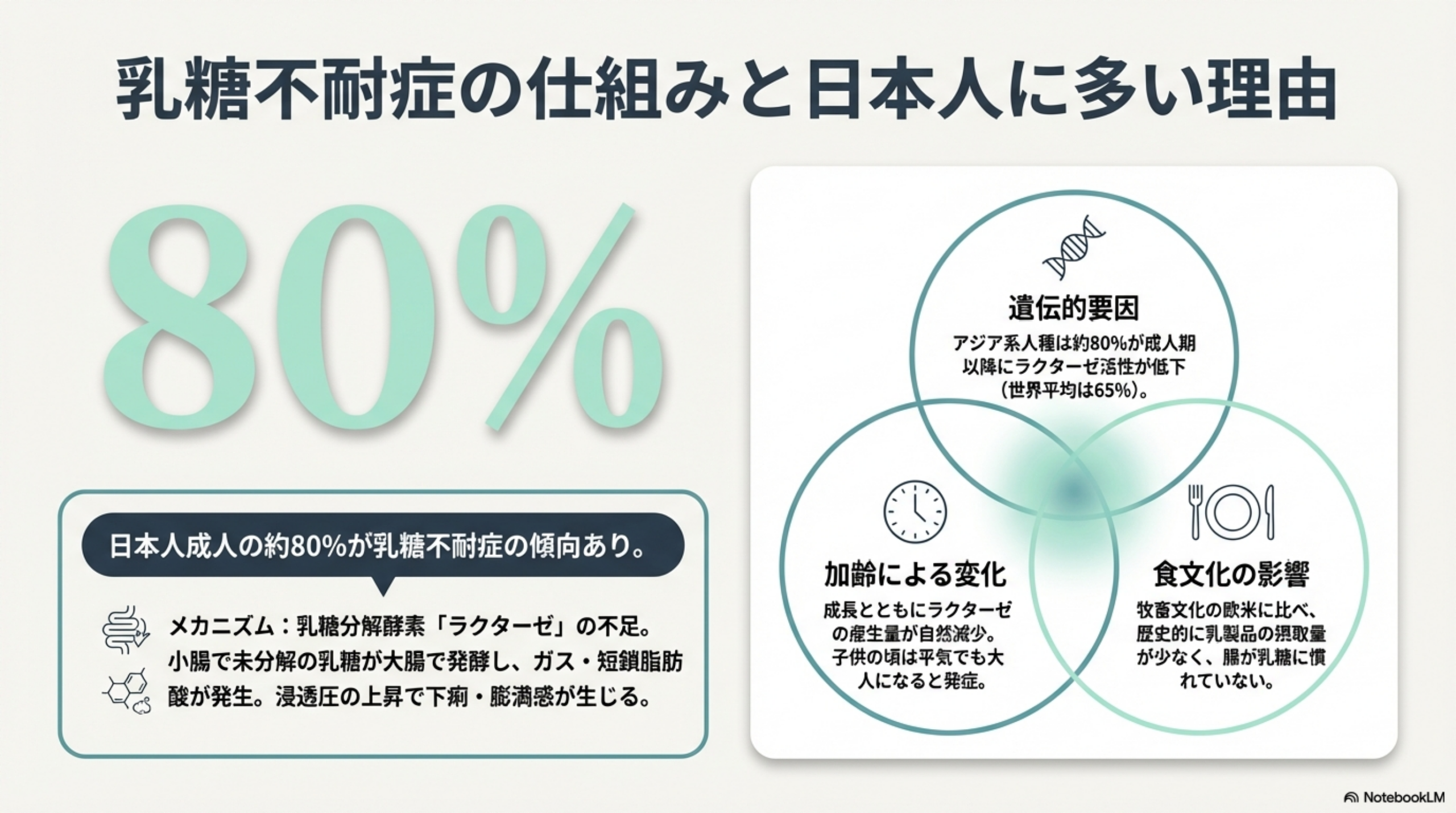 🧬 遺伝的要因:世界の人口の約65%はラクターゼの活性が成人期以降に低下する体質を持っています。日本人を含むアジア系人種はこの割合がさらに高く、約80%にのぼるとされています。牧畜文化が長く続いたヨーロッパ系の人々とは対照的に、日本では歴史的に乳製品の摂取量が少なかったため、乳糖を効率よく消化する能力が進化上必要とされませんでした。