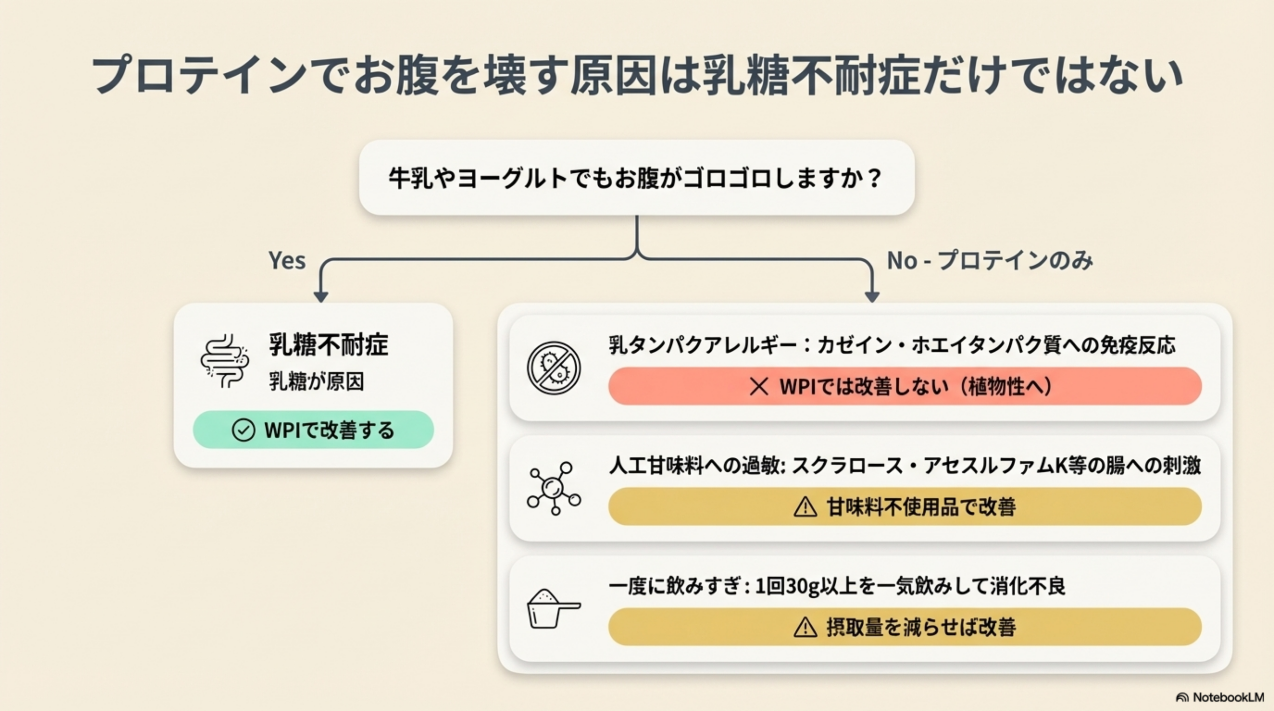 プロテインを飲んでお腹を壊す原因は、実は乳糖不耐症だけとは限りません。原因を正しく切り分けないと、WPIに変えても症状が改善しない場合があります。