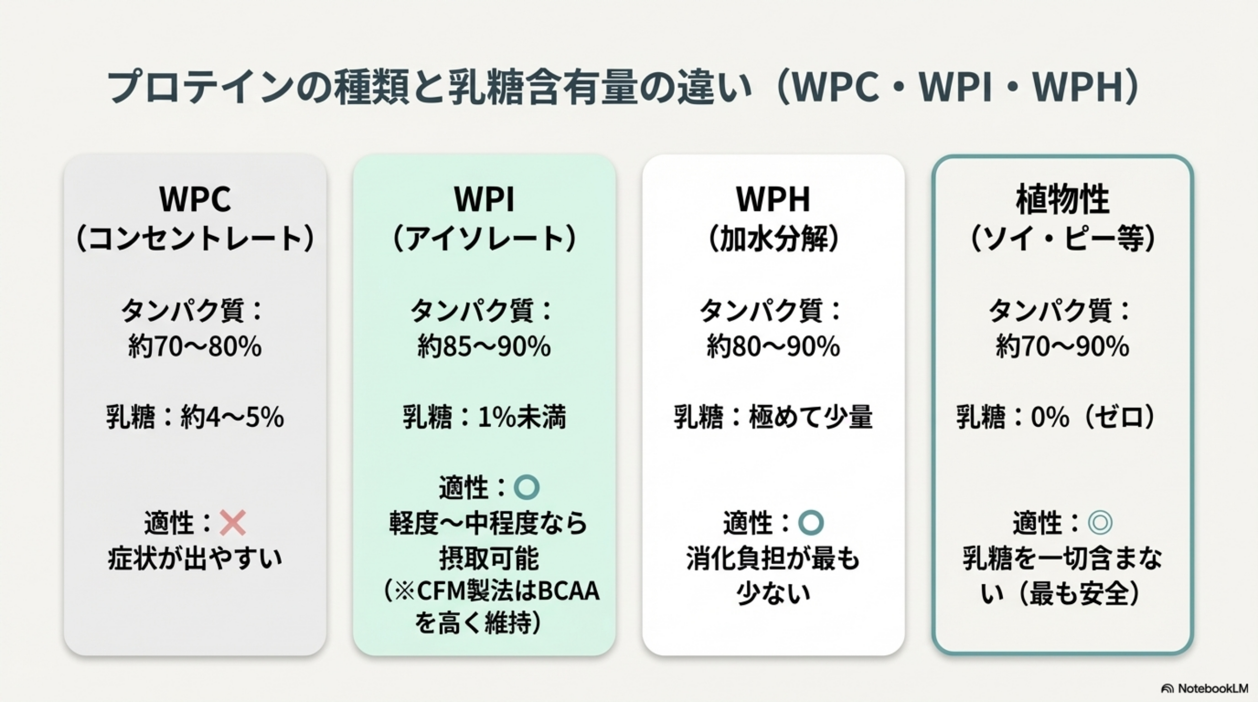 プロテインの種類と乳糖含有量の違い(WPC・WPI・WPH)