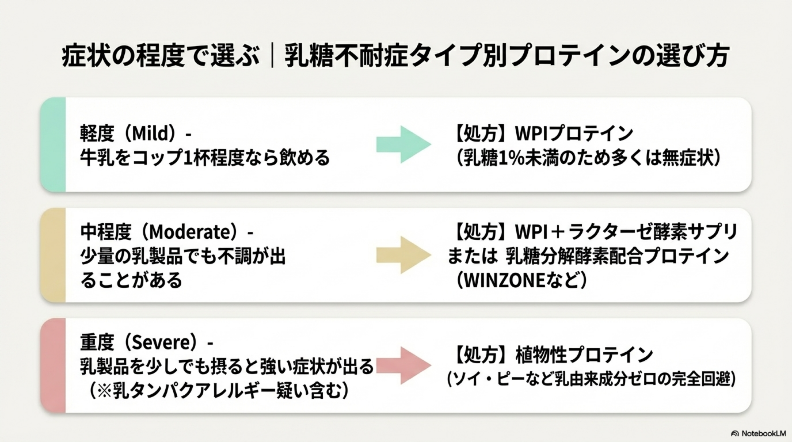 🟢 軽度(牛乳をコップ1杯程度なら飲める):WPIプロテインで十分対応できます。乳糖含有量が1%未満のため、多くの方で症状が出ません。