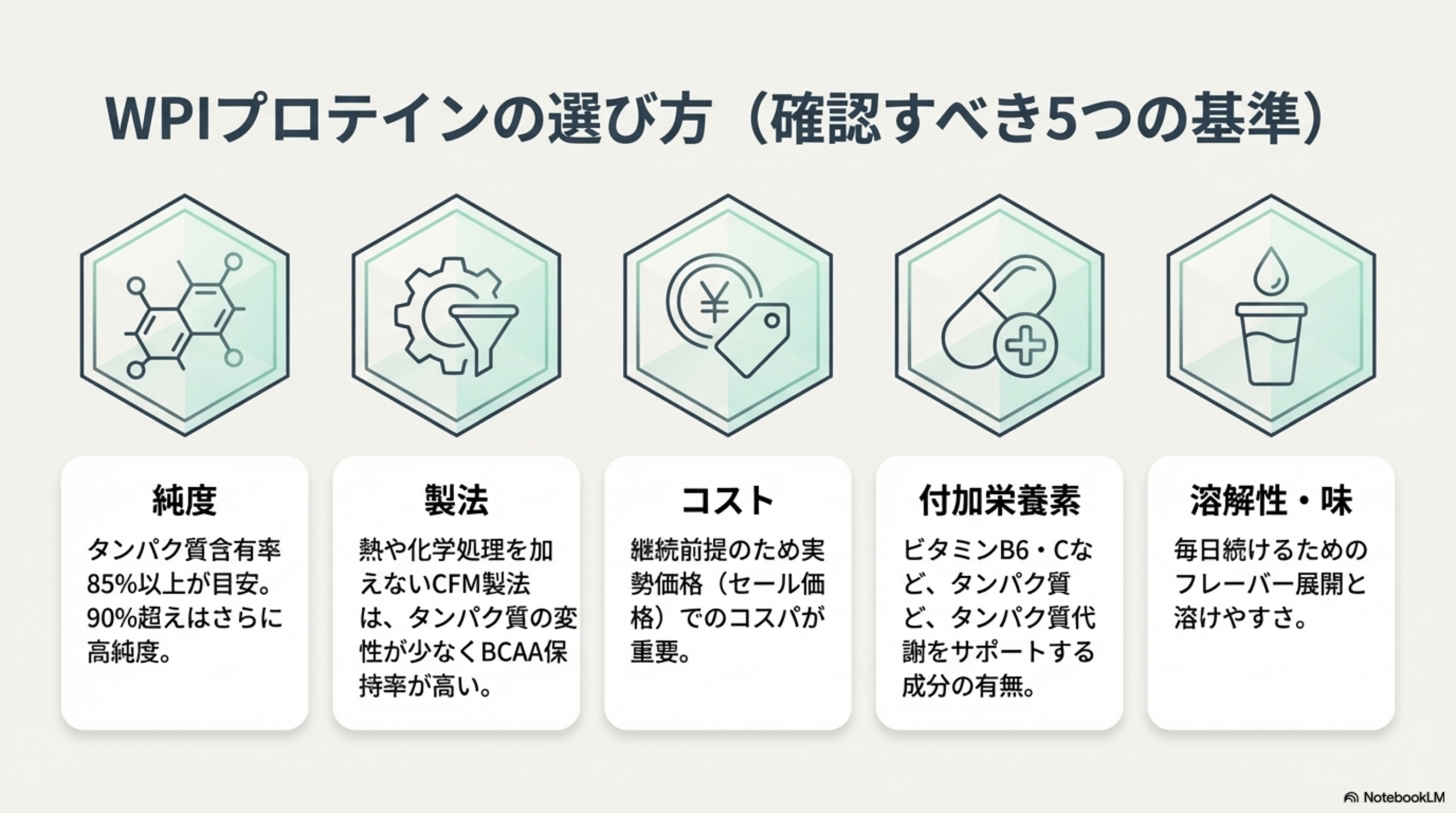 WPIプロテインを選ぶ際に確認すべき基準は以下の通りです。