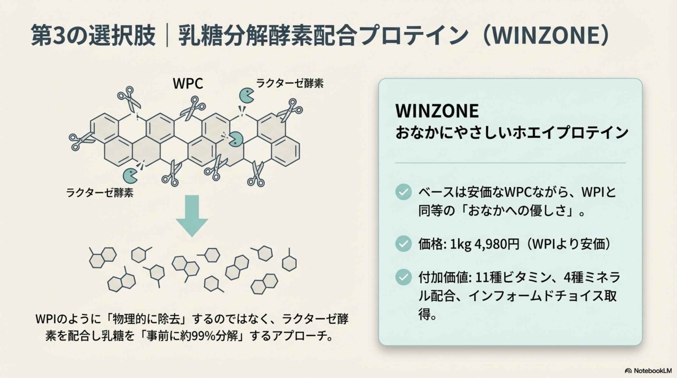 WINZONEの特徴は、原料段階で消化酵素ラクターゼを添加し、ホエイプロテインに含まれる乳糖を約99%カット(分解)している点にあります。ベースとなるタンパク質はWPCですが、乳糖が事前に分解されているため、WPIと同等の「おなかへの優しさ」を実現しています。