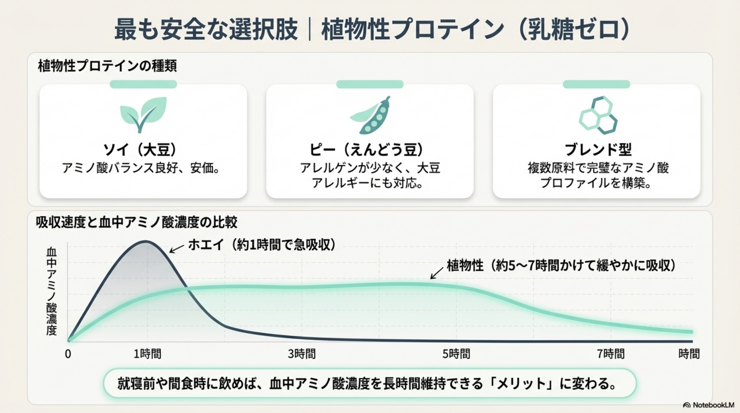 植物性プロテインは大豆やえんどう豆を原料としており、乳由来成分を一切含みません。乳糖不耐症の程度に関わらず、最も安全な選択肢です。